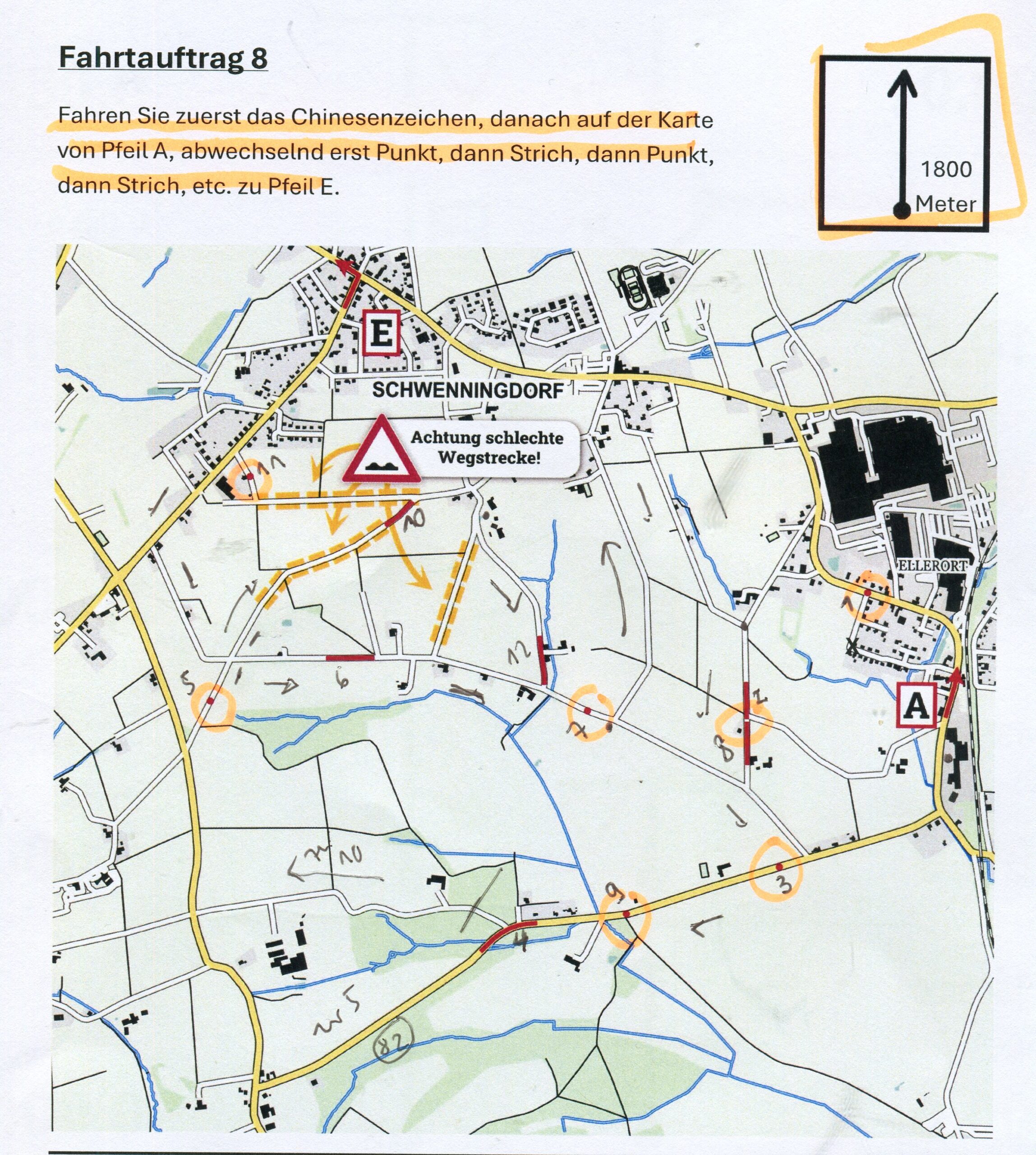 In der Expert-Klasse gab es auch 2025 einen Mix aus Chinesen- und Kartenaufgaben. Auf den ersten Blick wirkte das Ganze etwas einfacher als im Vorjahr. Die Fahrtregeln waren reduziert, also die Klassiker: Einbahnstraßenprinzip, Kreuzen verboten, kürzeste Strecke. Aus diesem Basis 1×1 hat der Fahrtleiter viel gemacht. Es zeigt sich, auch ohne Gehirntodformeln (auf die B85 nur links auffahren, ungerade Aufgaben anders als gerade Aufgaben, etc.) kann man eine anspruchsvolle Orientierungsfahrt gestalten. Und das auch noch sehr abwechslungsreich. Denn das möchte ich positiv hervorheben: in Rothenuffeln bekommt man immer einen sehr guten Mix verschiedener Aufgaben serviert, nicht nur das „wie immer“. Was diese Fahrt kennzeichnet, gab es auch anno 2025: Karten ohne Details, Überlappungen von Chinesen und Karten, sehr lange Schleifen. Sehr gut gefallen hat mir das Wiedersehen mit Schwarzenmoor sowie das Gekreisel nach dem Gaskraftwerk im Ort.