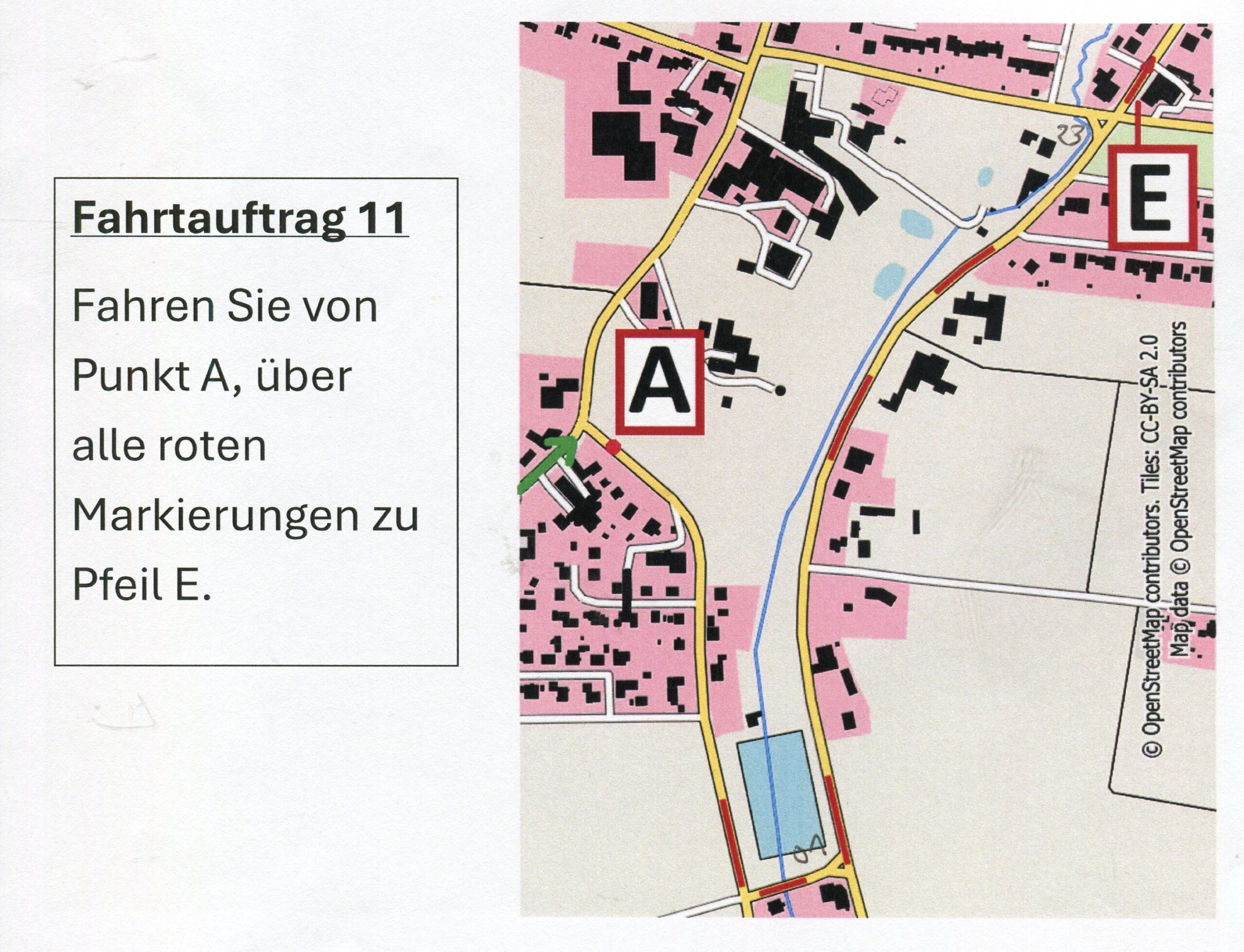 In Fahrtauftrag 8, kurz vor der Mittagspause, musste der Elefant das Wasser lassen. Ziemliches Gekreisel Punkt-Strich-Punkt-usw. Mit Konzentration absolut machbar. Leider haben wir übersehen, dass an einer entscheidenden Stelle die Straße zwar doppellinig, aber nicht angebunden war. Nach der Mittagspause kam man hier wieder vorbei und musste auf die „Lösbarkeit“ der Aufgabe achten.